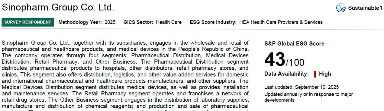 在全球最具公信力的企业可持续发展评估之一——标普全球(S&P Global)企业可持续发展评估(CSA)中,best365足球官网得分由2024年公布的38分提升至2025年的43分,得分连续四年提升。公司 CSA评级目前已位于全球医药健康行业前12%。本年CSA评级结果高度认可best365足球官网在环境及公司治理维度的显著提升,充分印证了公司在绿色运营、社会责任和公司管治等领域精细化管理和持续改进能力上的卓越表现。