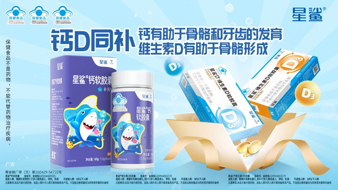 上市多年始终保持良好口碑的星鲨®维生素D与钙软胶囊,均以高标准把控原料品质,维生素D能促进钙的高效吸收,钙则为骨骼发育提供“核心动力”,二者协同形成“1+1>2”的营养效应。