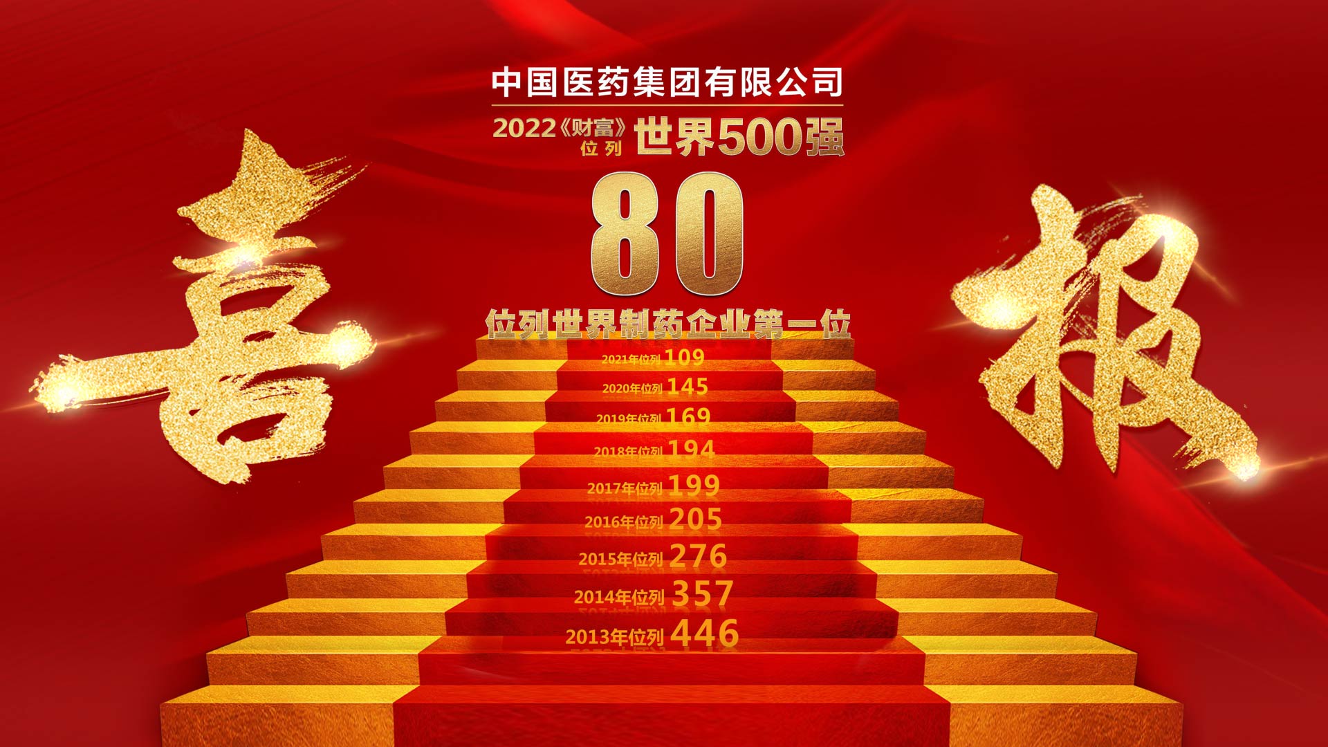 2022年《财富》世界500强排行榜,中国医药集团有限公司(简称“国药集团”)位列第80位,进入全球百强,位居全球制药企业第一位。党的十八大以来,国药集团担当中央企业主力军使命,积极投身健康中国战略,实现了“非凡十年”跨越式发展。